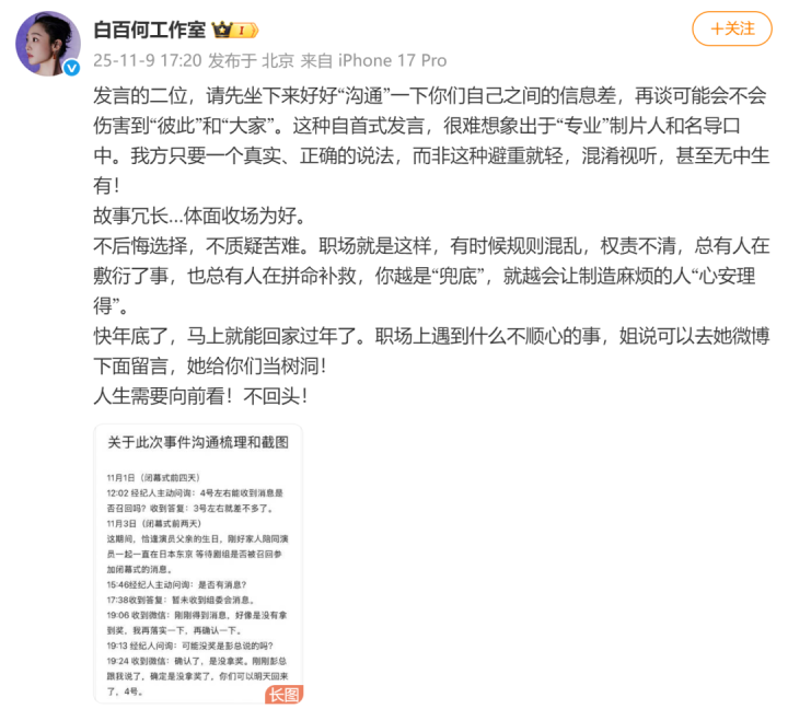 据现代快报消息:11月9日,“白百何工作室”官方账号发文回应近期东京电影节争议,并晒出了聊天记录和与相关人士沟通的时间线。
